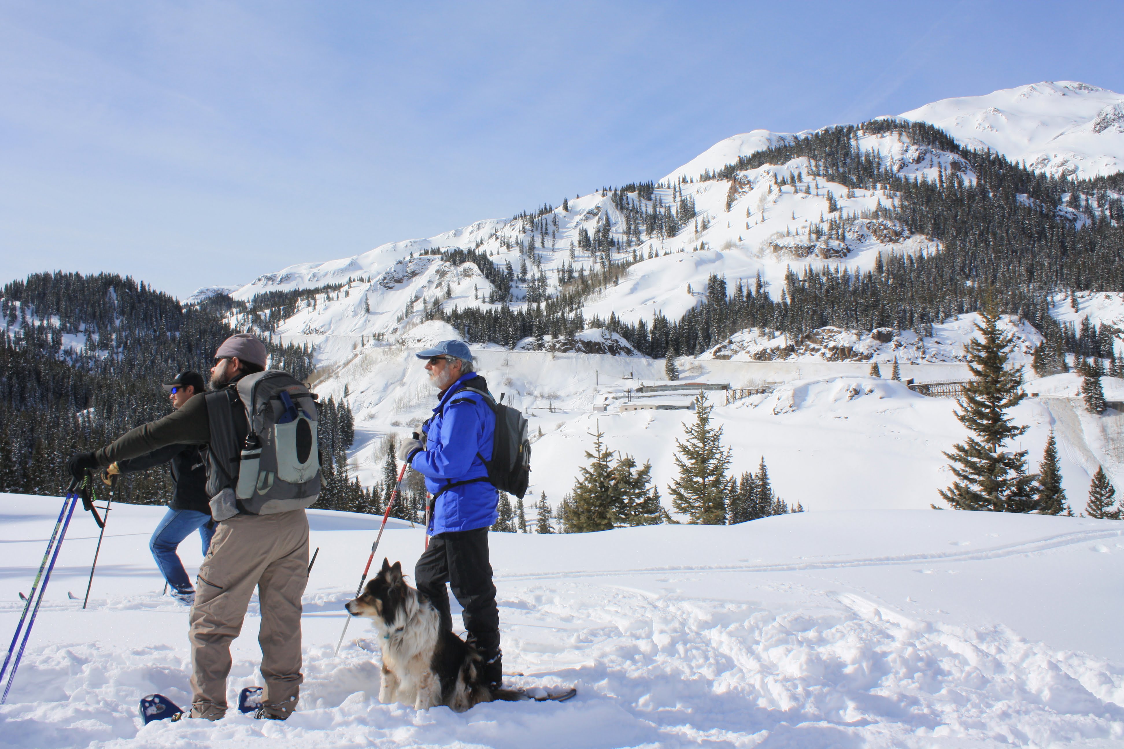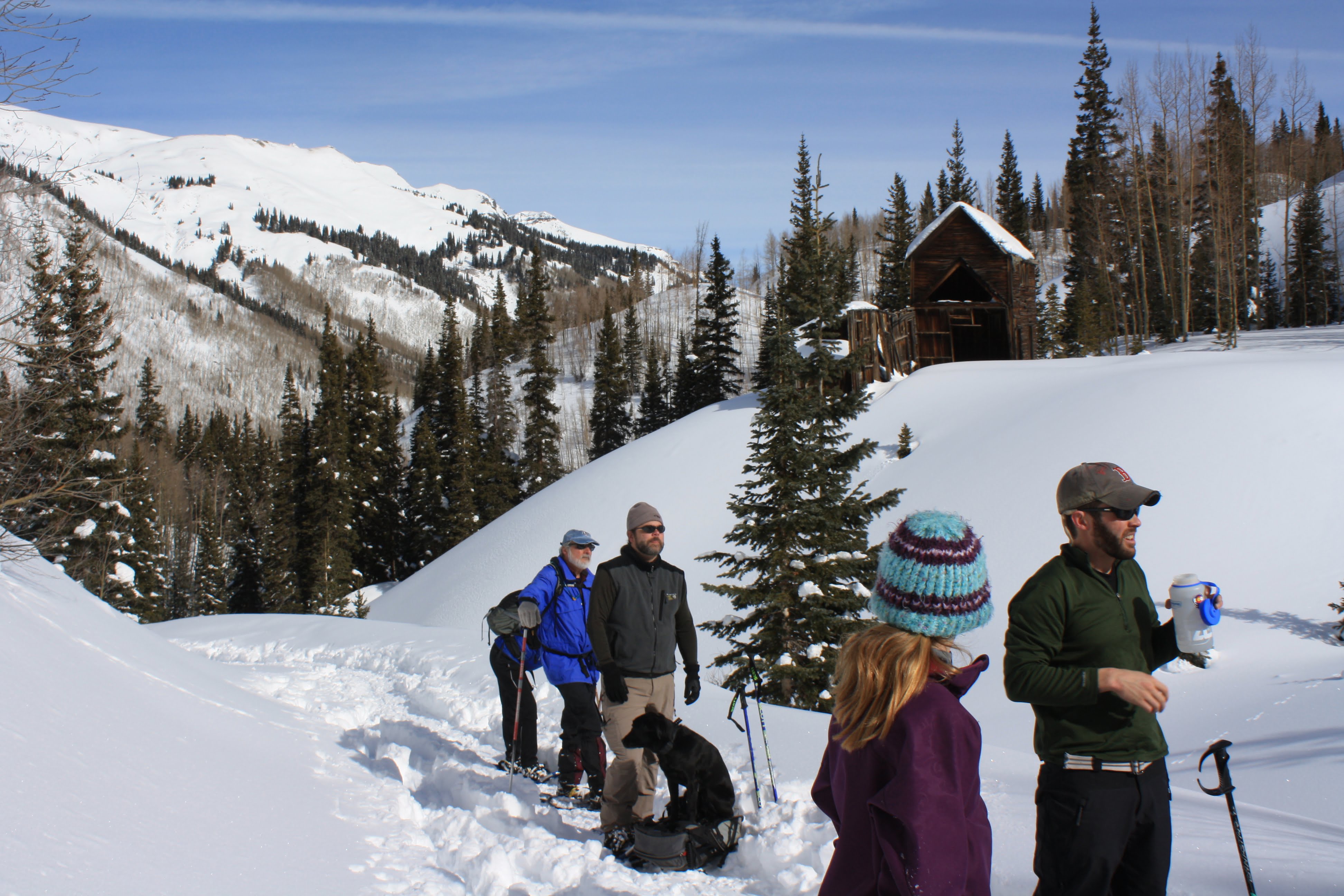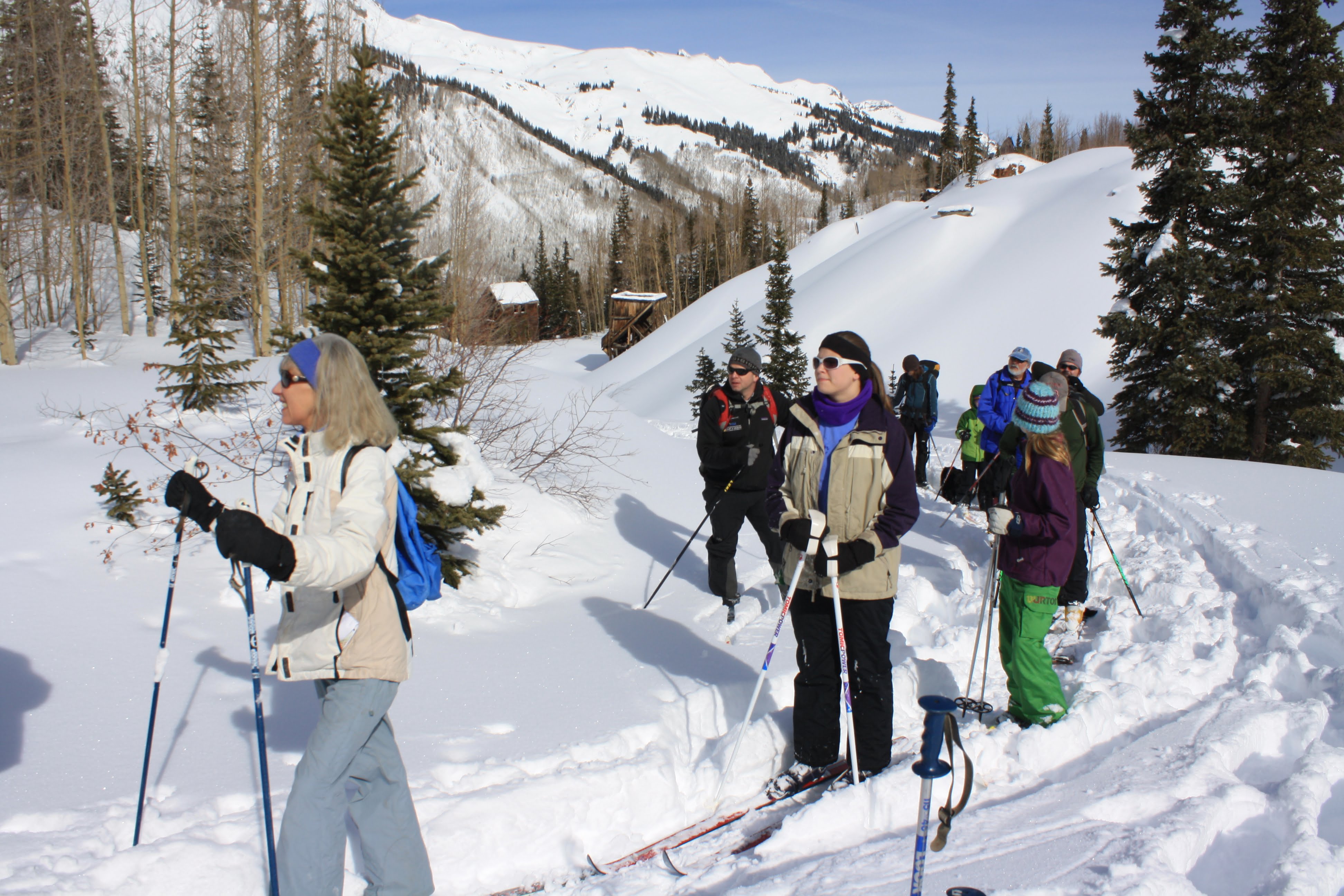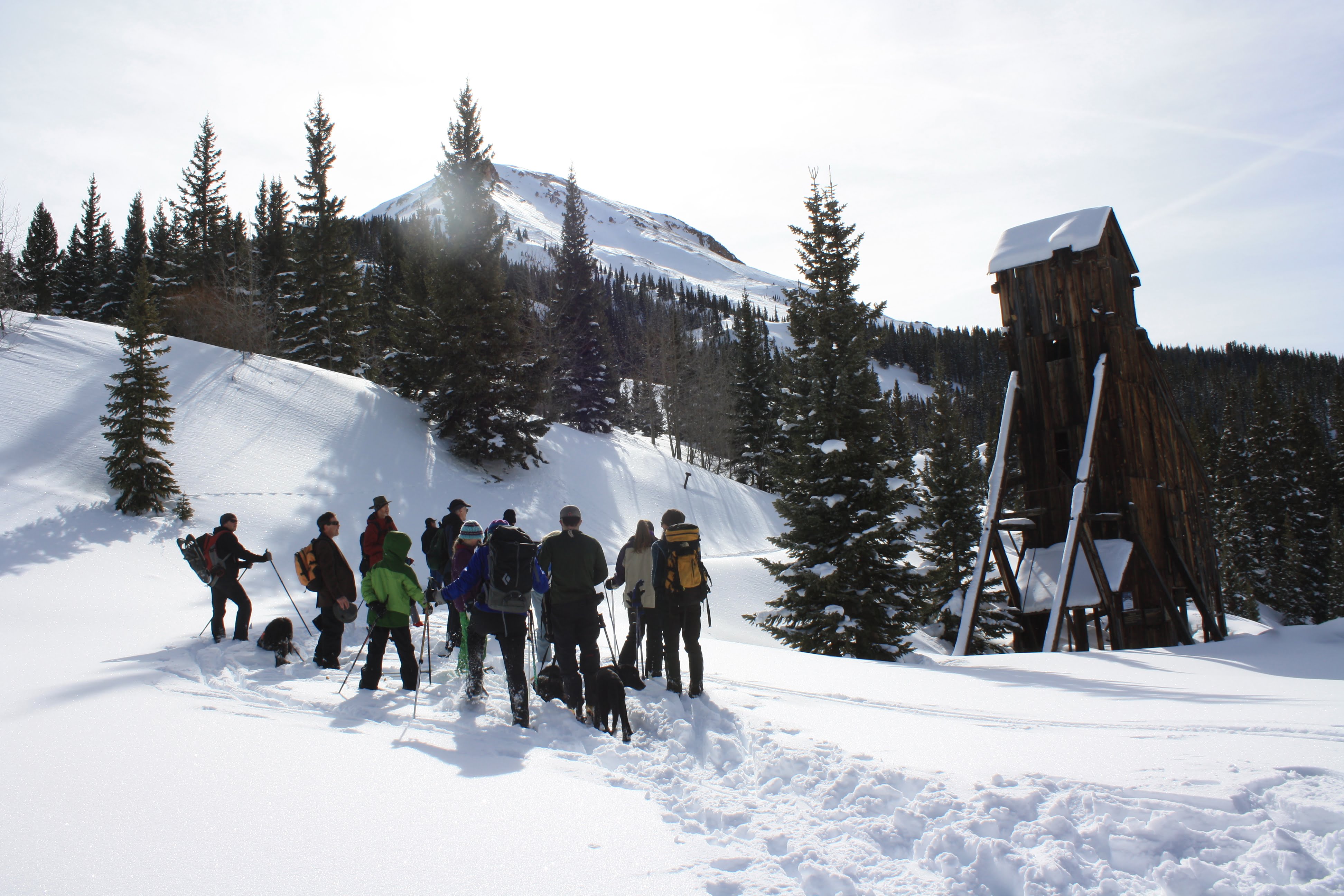 Dr. Don Paulson from the Ouray Historical Society lead us up the hill to view the most famous mines in Ouray including the Guston and the Yankee Girl. At the end of the tour, we enjoyed hot toddys, hot chocolate and snacks, then skiied down.